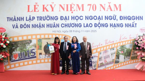 Cũng tại buổi lễ, Hiệu trưởng Nguyễn Xuân Long đã tặng hoa tri ân các thầy, cô nguyên lãnh đạo của trường các thời kỳ, ghi nhận công lao và đóng góp của các thế hệ cán bộ, học sinh, sinh viên Trường Đại học Sư phạm Ngoại ngữ – nay là Trường Đại học Ngoại ngữ, ĐHQGHN, những người đã đặt nền móng vững chắc và vun đắp sự phát triển của Nhà trường. Đây cũng là dịp tôn vinh những nỗ lực rèn luyện, nghiên cứu, sáng tạo và hoàn thiện kỹ năng của cán bộ, học sinh, sinh viên hiện nay, góp phần xây dựng Tổ quốc Việt Nam giàu mạnh, văn minh. Trong không khí trang trọng, các thầy, cô nguyên Hiệu trưởng và Phó Hiệu trưởng các thời kỳ đại diện cho các thế hệ cán bộ, học sinh, sinh viên lên tặng hoa, thay cho lời cảm ơn sâu sắc từ tập thể lãnh đạo Trường Đại học Ngoại ngữ.