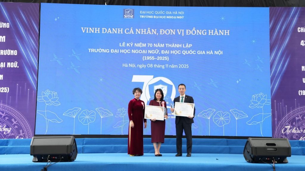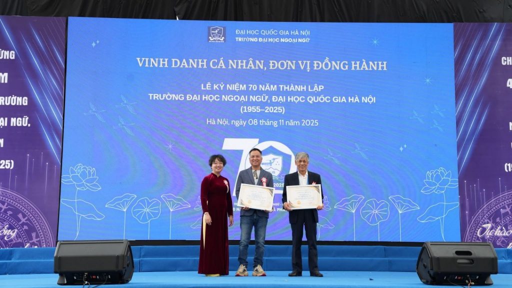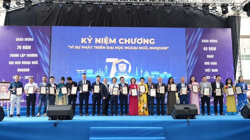Tiếp nối chương trình, Trường Đại học Ngoại ngữ đã trao kỷ niệm chương, vinh danh các cá nhân, đơn vị đồng hành và cựu người học trong khuôn khổ Lễ kỷ niệm 70 năm thành lập Nhà trường. Hoạt động này nhằm ghi nhận những đóng góp, đồng hành và cống hiến của các thế hệ, đơn vị đối với sự phát triển của Trường.