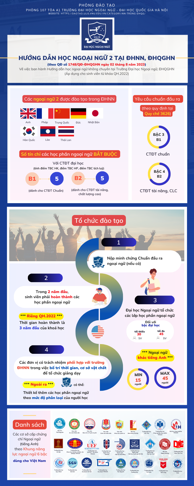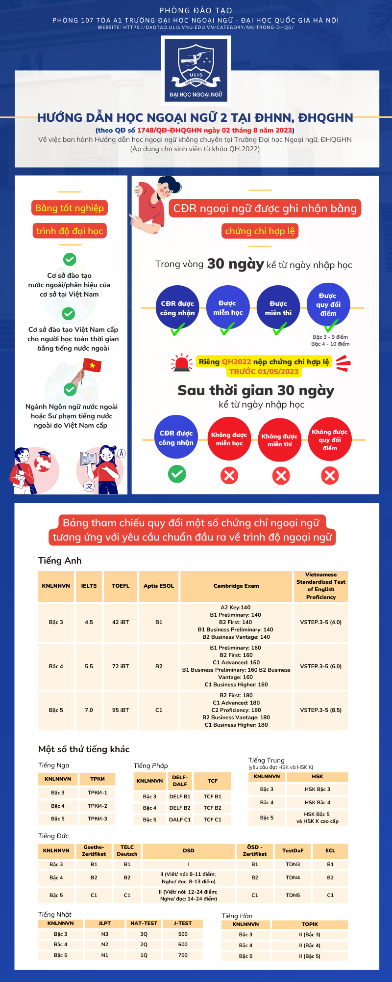 QĐ số 1748/QĐ-ĐHNN về việc ban hành Hướng dẫn học ngoại ngữ không chuyên tại Trường Đại học Ngoại ngữ, ĐHQGHN (Áp dụng cho sinh viên từ khóa QH.2022) ban hành ngày 2 tháng 8 năm 2023