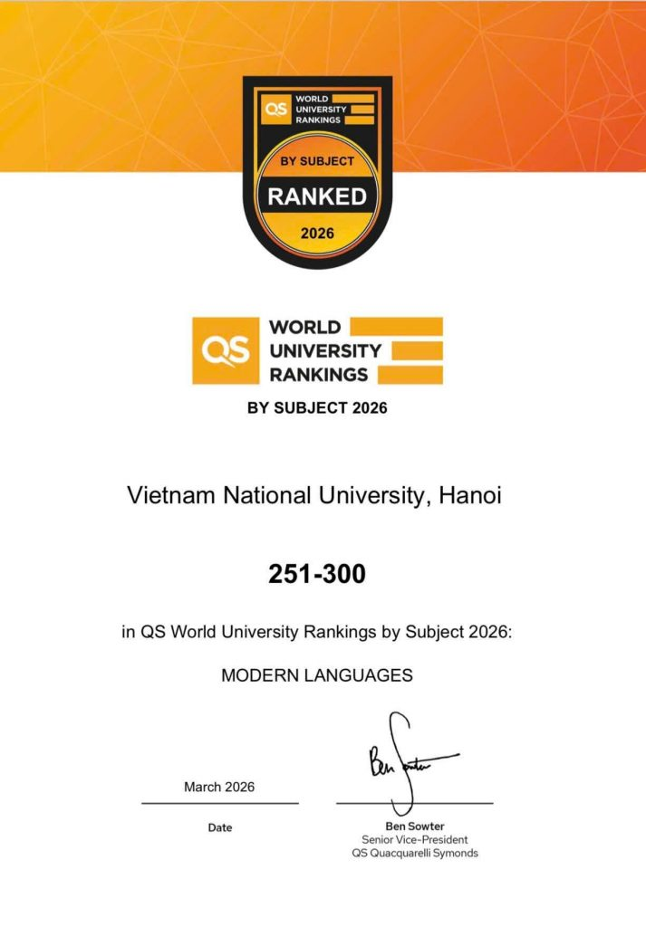 Trong bối cảnh hội nhập giáo dục toàn cầu, Trường Đại học Ngoại ngữ không ngừng khẳng định vị thế là một trong những đơn vị đào tạo ngoại ngữ và nghiên cứu ngôn ngữ hàng đầu cả nước, đồng thời đóng vai trò quan trọng trong kết quả xếp hạng của ĐHQGHN ở lĩnh vực Ngôn ngữ học và Ngôn ngữ hiện đại.