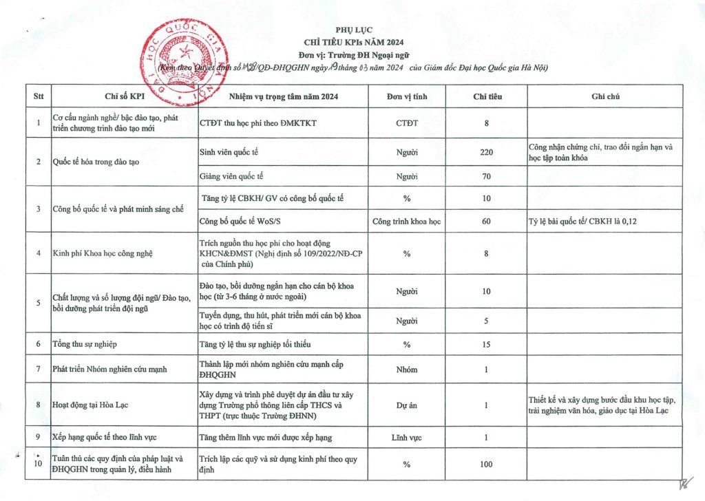 Trong bức tranh chung đó, Trường Đại học Ngoại ngữ đã triển khai nhiều hoạt động gắn trực tiếp với các tiêu chí xếp hạng, đóng góp vào gia tăng xếp hạng của hai lĩnh vực nói trên của ĐHQGHN. Theo hệ thống chỉ tiêu đánh giá hiệu quả (KPIs) năm 2024 của ĐHQGHN, Nhà trường được giao các nhiệm vụ trọng tâm như gia tăng công bố quốc tế, phát triển đội ngũ giảng viên có trình độ cao, mở rộng hợp tác quốc tế và xây dựng các nhóm nghiên cứu. Đây là những nội dung cốt lõi, tác động trực tiếp đến các tiêu chí về uy tín học thuật, năng suất nghiên cứu và mạng lưới học thuật quốc tế.