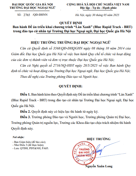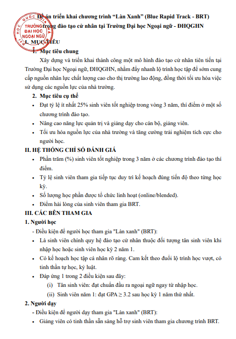 Quyết Định Ban hành Đề án triển khai chương trình “Làn Xanh” (Blue Rapid Track – BRT)trong đào tạo cử nhân tại Trường Đại học Ngoại ngữ, Đại học Quốc gia Hà Nội