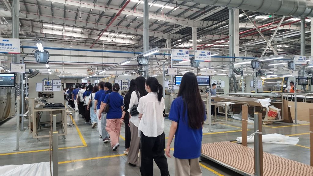 Trong khuôn khổ chương trình, sinh viên đã được tham quan trực tiếp các xưởng sản xuất của công ty. Tại đây, các bạn có cơ hội quan sát quy trình vận hành, hệ thống máy móc và dây chuyền sản xuất hiện đại. Những trải nghiệm thực tế này giúp sinh viên hiểu rõ hơn về môi trường làm việc trong ngành công nghiệp, cũng như yêu cầu về tính kỷ luật, sự chính xác và tinh thần trách nhiệm trong công việc.