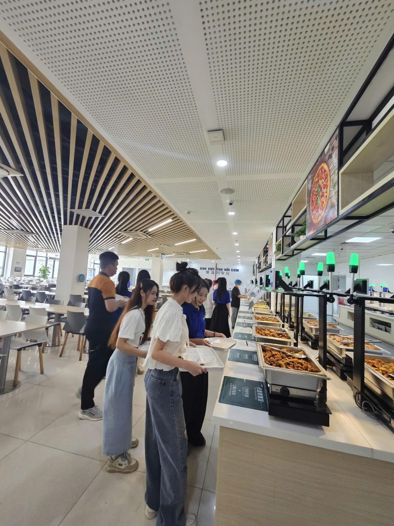 Bên cạnh đó, đoàn còn được tham quan khu ký túc xá dành cho nhân viên, qua đó có cái nhìn toàn diện hơn về đời sống sinh hoạt và chế độ phúc lợi của doanh nghiệp. Đặc biệt, sinh viên còn được trải nghiệm bữa ăn tại công ty, góp phần cảm nhận rõ hơn về môi trường làm việc và điều kiện sinh hoạt thực tế của người lao động.