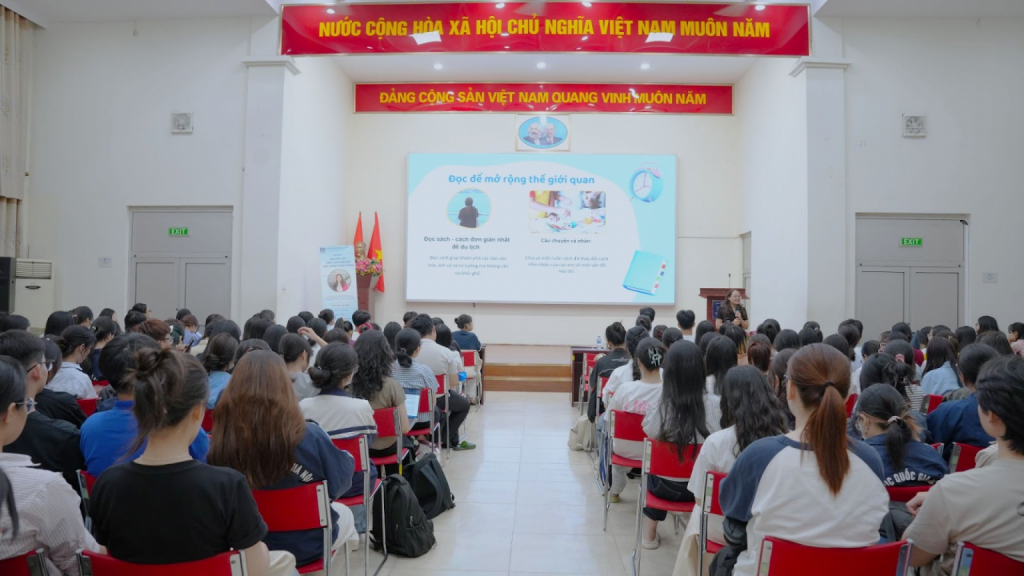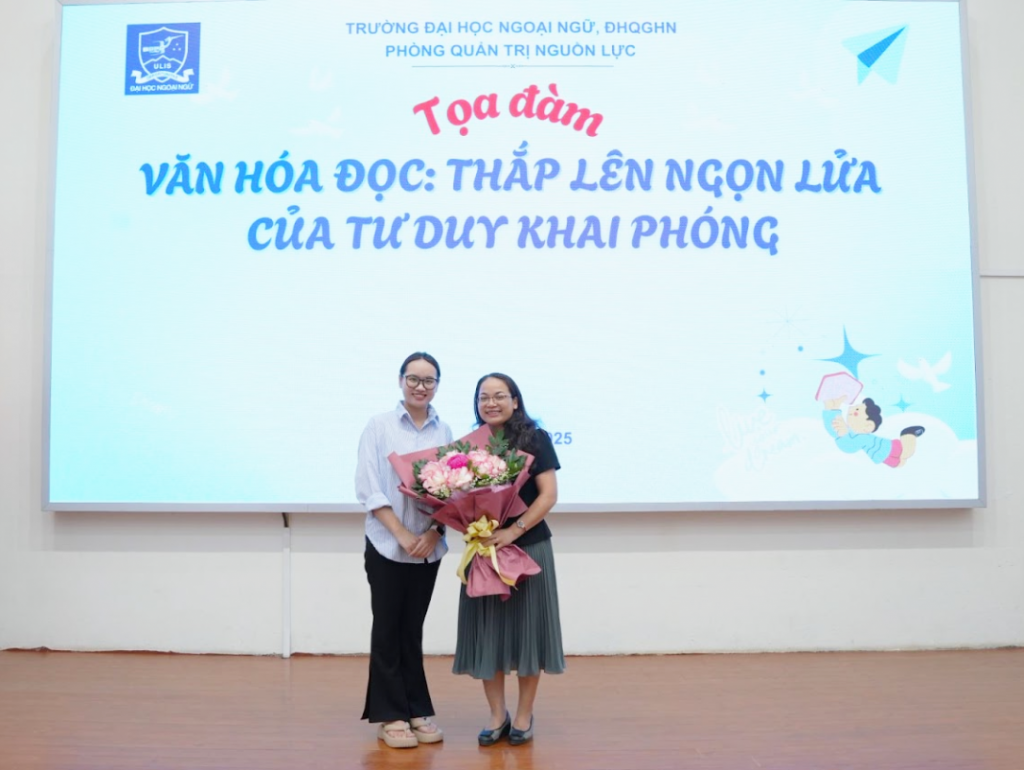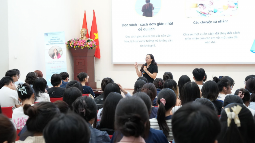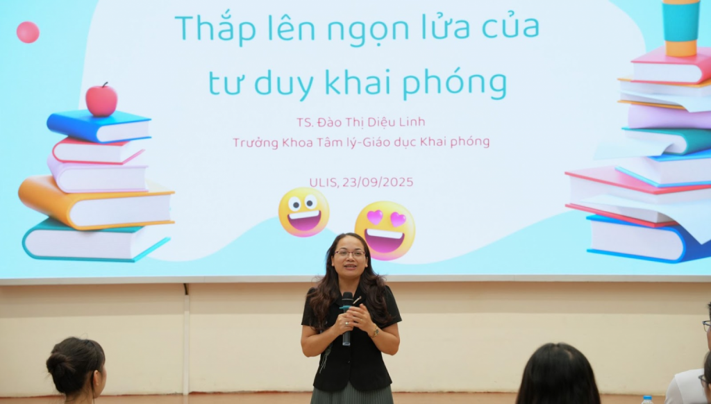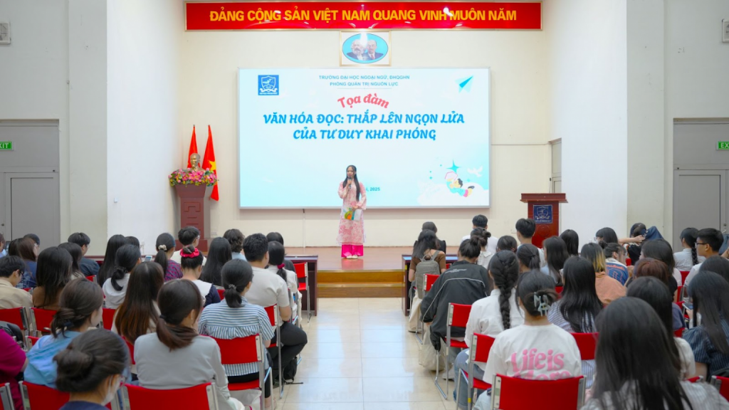 Ngày 23/09/2025, hơn 200 sinh viên Trường Đại học Ngoại ngữ – Đại học Quốc gia Hà Nội đã tham gia buổi tọa đàm văn hóa đọc “Thắp lên ngọn lửa của tư duy khai phóng”. Đây là hoạt động thường niên do Bộ phận Công nghệ thông tin, thiết bị & học liệu thuộc Phòng Quản trị Nguồn lực tổ chức tại Hội trường Vũ Đình Liên với diễn giả là Trưởng Khoa Tâm lý – Giáo dục khai phóng – TS. Đào Thị Diệu Linh.
