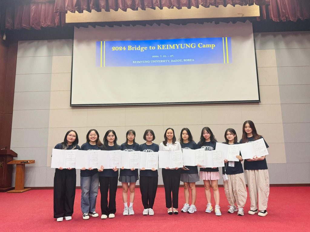 Từ ngày 21/7/2024 đến ngày 27/7/2024, 9 sinh viên xuất sắc của Khoa Ngôn ngữ & Văn hóa Hàn Quốc của Trường Đại học Ngoại ngữ – ĐHQGHN đã có cơ hội tham gia chương trình học bổng trại hè “Bridge to Keimyung 2024” tại Hàn Quốc với sự dẫn dắt của giảng viên Nguyễn Thị Hồng Vân.