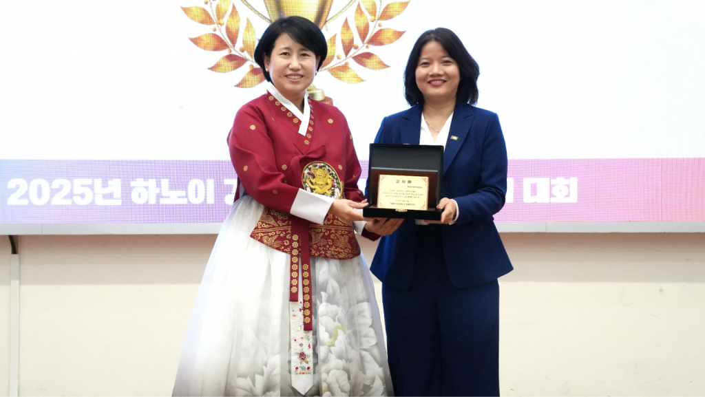 Trong khuôn khổ chương trình, cô Kim Yanghee đã trao kỷ niệm chương cho TS. Trần Thị Hường nhằm ghi nhận những đóng góp tích cực của cô trong việc triển khai giao lưu học thuật và thúc đẩy phong trào học tiếng Hàn, đồng thời bày tỏ mong muốn sự hợp tác lâu dài giữa Trường Đại học Ngoại ngữ cùng dự án Gyeongbuk Hakdang. Phần trao kỷ niệm chương diễn ra trong không khí trang trọng, tạo nên điểm nhấn ý nghĩa cho chương trình.