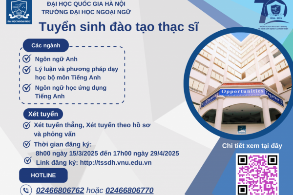 Thực hiện kế hoạch năm học, căn cứ Đề án tuyển sinh sau đại học năm 2025 của Trường Đại học Ngoại ngữ, Đại học Quốc gia Hà Nội (ĐHNN, ĐHQGHN), Trường Đại học Ngoại ngữ, ĐHQGHN thông báo tuyển sinh đào tạo trình độ
