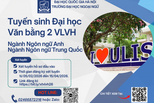Trường Đại học Ngoại ngữ, Đại học Quốc gia Hà Nội thông báo kế hoạch tuyển sinh đại học vừa làm vừa học năm 2026 như sau: 1. Chỉ tiêu tuyển sinh: 350 chỉ tiêu 2. Đối tượng tuyển sinh: người đã có bằng tốt nghiệp đại