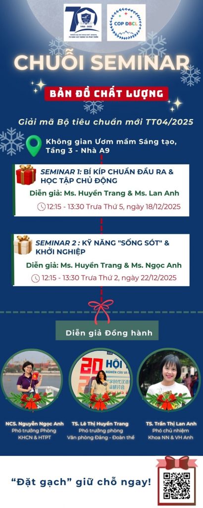 💡Hãy cùng đặt gạch và đến với chuỗi seminar Giải mã Bộ tiêu chuẩn mới TT04/2025/TT-BGDĐT siêu chất lừ, siêu chất lượng cùng dàn cast kiêm diễn giả siêu chất từ trường Đại học Ngoại ngữ – Đại học Quốc gia Hà Nội, với TS. Trần Thị Lan Anh, Phó chủ nhiệm Khoa NN&VH Anh – Giảng viên Khoa Ngôn ngữ & Văn hóa Anh; TS. Lê Thị Huyền Trang – Phó trưởng phòng Văn phòng Đảng – Đoàn thể; ThS.Nguyễn Ngọc Anh, Phó trưởng Phòng KHCN&HTPT!