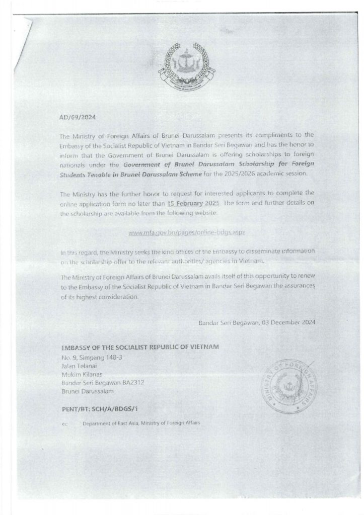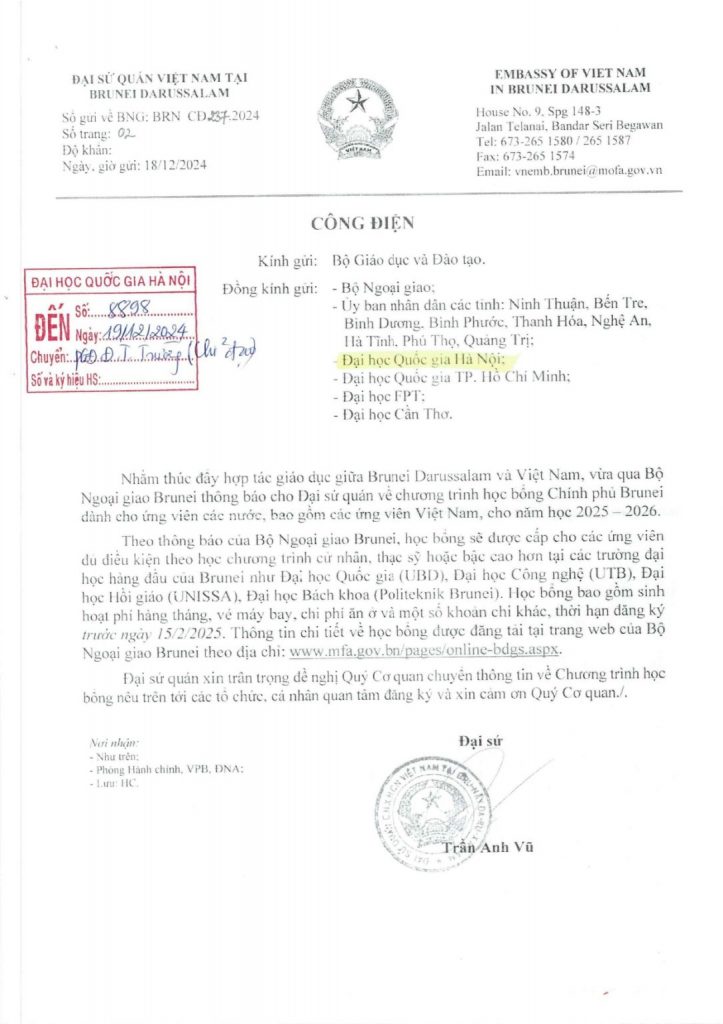 được Công điện số 8898 ngày 19 tháng 12 năm 2024 của Đại sứ quán Việt Nam tại Brunei Darussalam về chương trình học bổng của Chính phủ Brunei dành cho Việt Nam (Công điện được kèm theo công văn này).