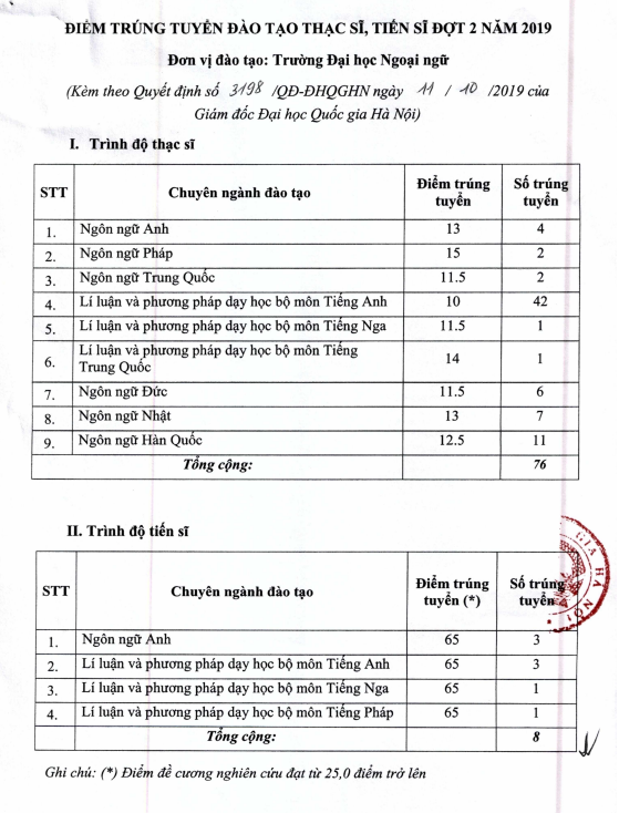 Trường Đại học Ngoại ngữ – ĐHQGHN xin thông báo điểm trúng tuyển kỳ thi tuyển sinh sau đại học đợt 2 năm 2019 (theo Quyết định số 3198/QĐ-ĐHQGHN ngày 11/10/2019 của Giám đốc Đại học Quốc gia Hà Nội) tới thí sinh dự tuyển đào tạo thạc sĩ và tiến sĩ như sau: