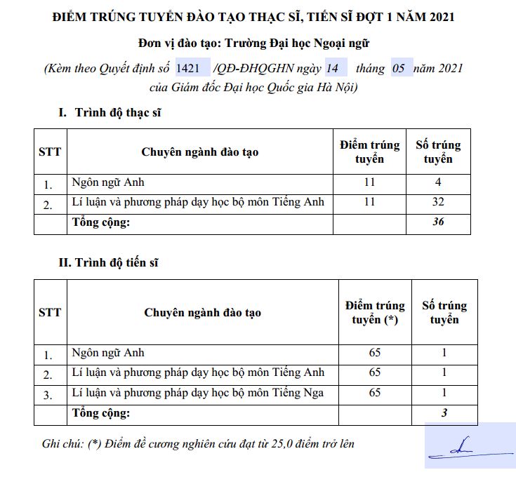 1.Trường Đại học Ngoại ngữ – ĐHQGHN xin thông báo điểm trúng tuyển kỳ thi tuyển sinh sau đại học đợt 1 năm 2021 (theo Quyết định số 1421/QĐ-ĐHQGHN ngày 14/5/2021 của Giám đốc Đại học Quốc gia Hà Nội) tới thí sinh dự tuyển đào tạo thạc sĩ và tiến sĩ như sau:
