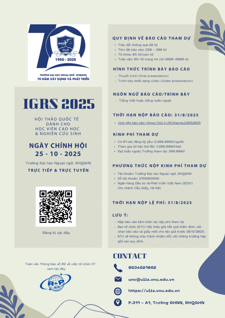 Tiếp theo thông báo số 01 ngày 11 tháng 11 năm 2024, Trường Đại học Ngoại ngữ, ĐHQGHN (Trường ĐHNN,ĐHQGHN) thông báo một số nội dung bổ sung, điều chỉnh về việc tổ chức Hội thảo quốc tế IGRS dành cho học viên cao học và nghiên cứu sinh như sau: