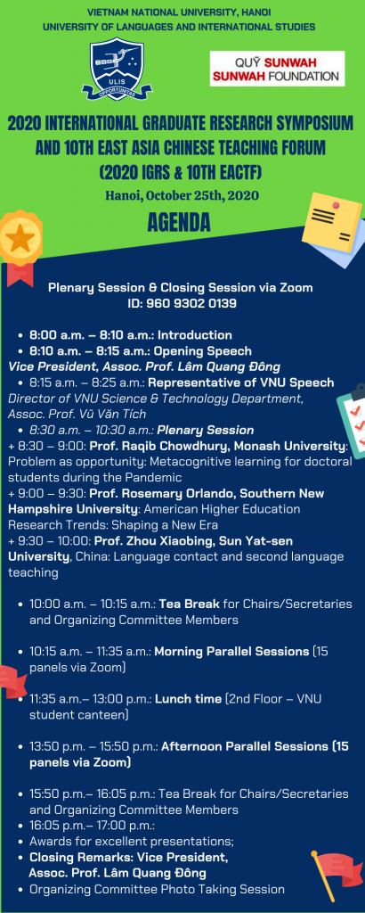 Trường Đại học Ngoại ngữ xin trân trọng thông báo Hội thảo khoa học quốc tế năm 2020 và diễn đàn lần thứ X về nghiên cứu giảng dạy tiếng Hán khu vực Đông Á dành cho HVCH & NCS tại trường ĐHNN-ĐHQGHN (2020 IGRS & 10TH EACTF) bao gồm 3 phiên tiền hội thảo và hội thảo, cụ thể: