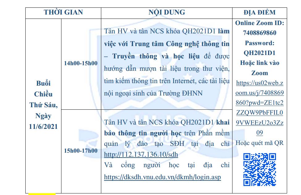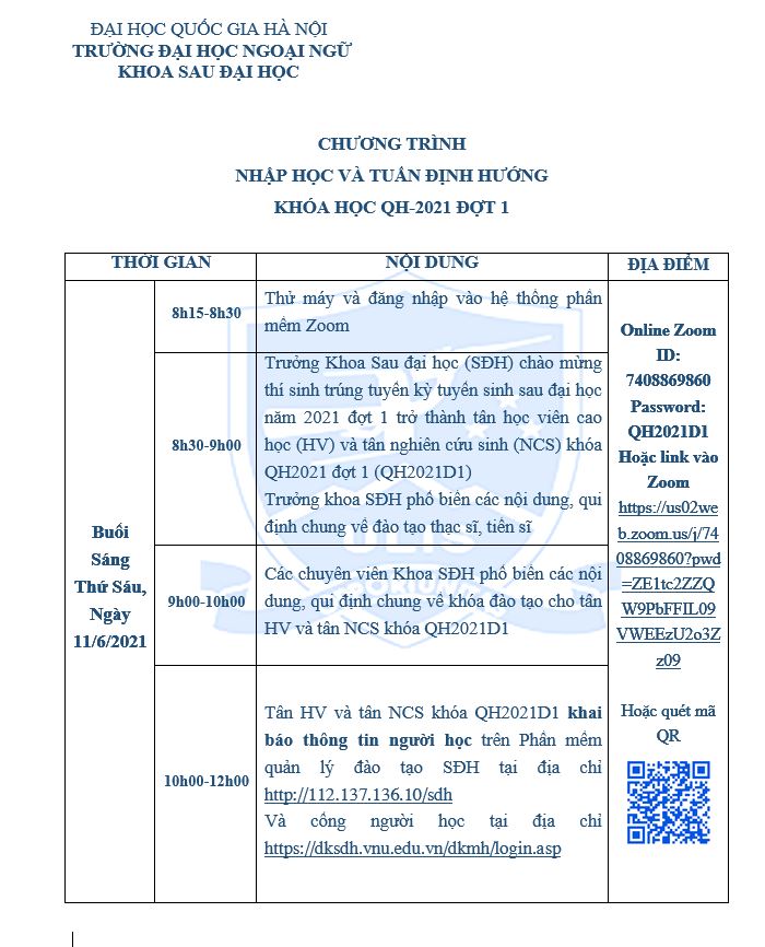- Chương trình buổi nhập học và tuần định hướng khóa học QH2021 đợt 1 theo hình thức trực tuyến tại địa chỉ Zoom ID 7408869860 Password: QH2021D1 hoặc nhấn vào đường link https://us02web.zoom.us/j/7408869860?pwd=ZE1tc2ZZQW9PbFFIL09VWEEzU2o3Zz09