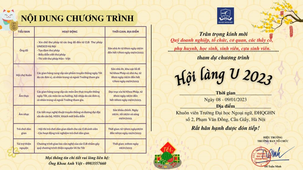 Chi tiết các hoạt động xem tại: https://ulis.vnu.edu.vn/cac-hoat-dong-vui-xuan-noi-bat-tai-hoi-lang-u-2023/