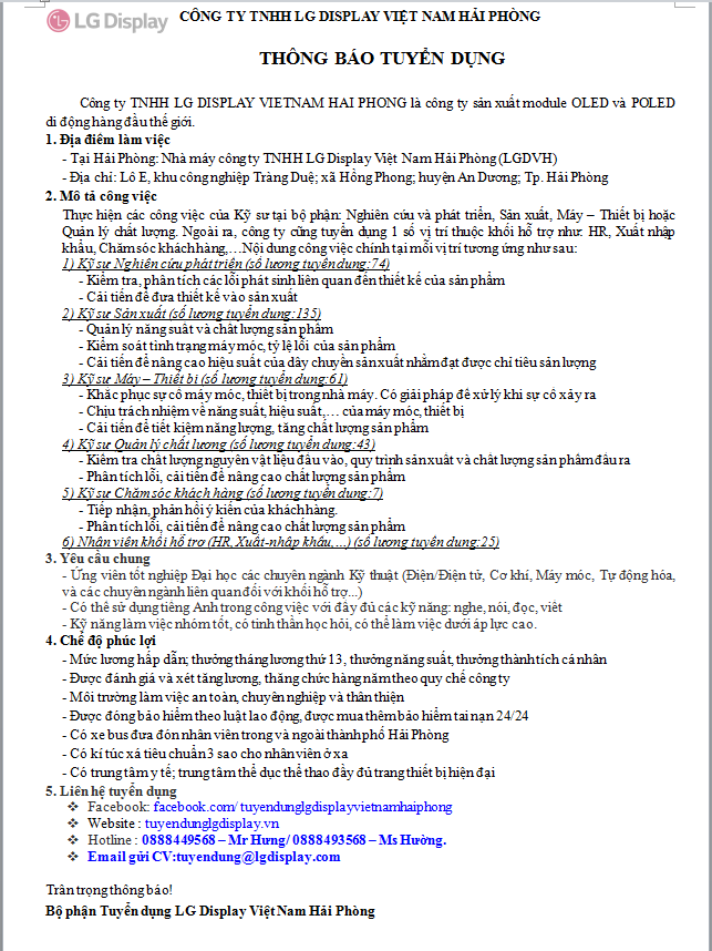 THÔNG BÁO TUYỂN DỤNG CÔNG TY TNHH LG DISPLAY VIỆT NAM HẢI PHÒNG Th7 18, 2022 in Thực tập nghiệp vụ Thông tin về việc tuyển dụng các bạn vui lòng xem tại dưới đây. Xin trân trọng cám ơn! Tagged with: thongtinvieclam