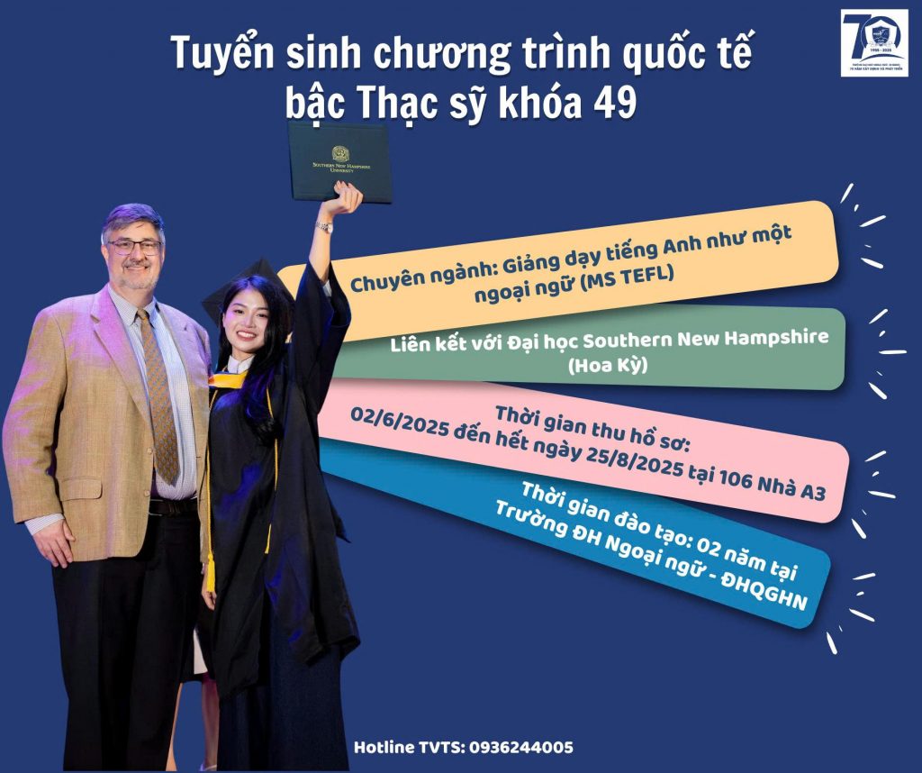 Trường Đại học Ngoại ngữ – Đại học Quốc gia Hà Nội tuyển sinh đào tạo thạc sĩ Giảng dạy tiếng Anh như một ngoại ngữ (MS TEFL) liên kết với trường Đại học Southern New Hampshire (Hoa Kỳ) Khóa PG 49 (2025 – 2027)