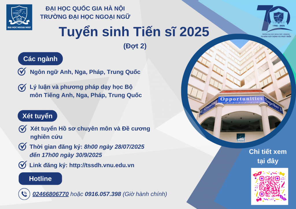 Thực hiện kế hoạch năm học 2024-2025, căn cứ Đề án tuyển sinh sau đại học năm 2025 của Trường Đại học Ngoại ngữ, Đại học Quốc gia Hà Nội (ĐHNN, ĐHQGHN), Trường Đại học Ngoại ngữ, ĐHQGHN thông báo tuyển sinh đào tạo trình độ tiến sĩ đợt 1 năm 2025, cụ thể như sau:
