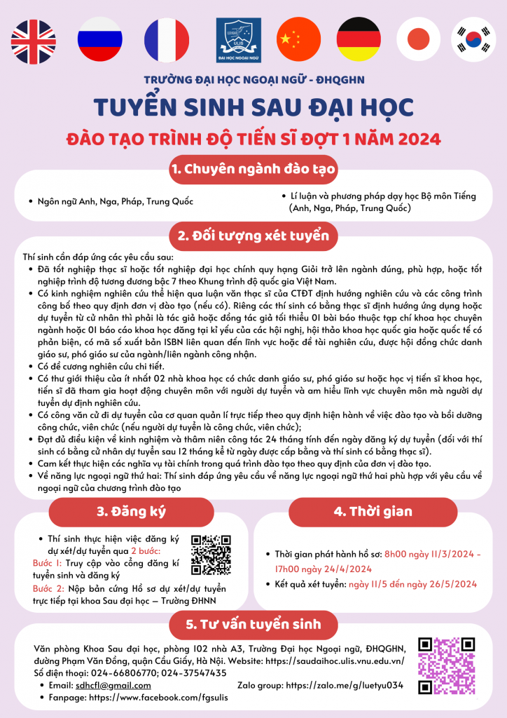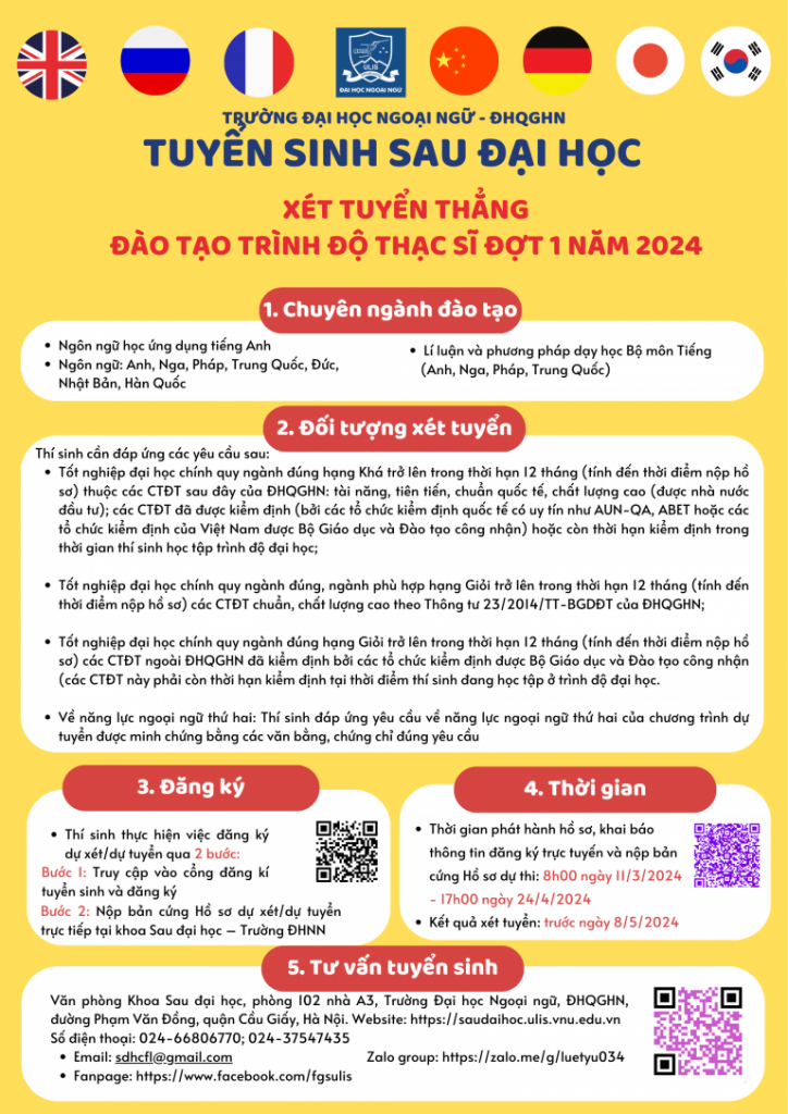 Thông báo tuyển sinh sau đại học đợt 1 năm 2024 của Trường Đại học Ngoại ngữ, Đại học Quốc gia Hà Nội