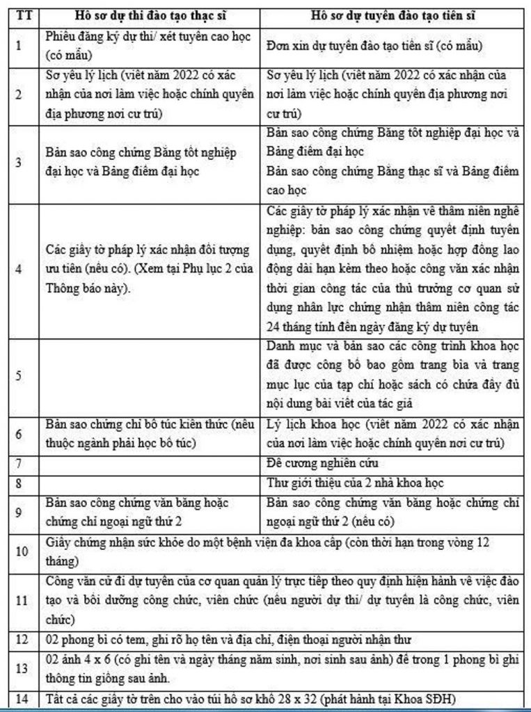 Ghi chú: – Khoa Sau đại học không hoàn trả bản cứng Hồ sơ đăng ký dự thi/dự tuyển đào tạo thạc sĩ/tiến sĩ của thí sinh đã nộp. Đối với bậc đào tạo tiến sĩ, thí sinh là công chức/ viên chức thì bắt buộc nộp kèm Hồ sơ dự tuyển Công văn cử đi dự tuyển và Công văn cử đi học của cơ quan/ đơn vị quản lý trực tiếp (nếu thí sinh trúng tuyển).