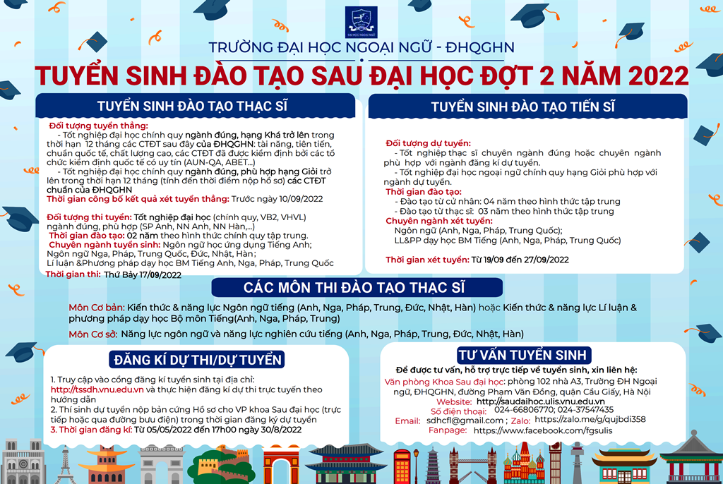 Thông báo tuyển sinh sau đại học đợt 2 năm 2022 của Trường Đại học Ngoại ngữ, ĐHQGHN