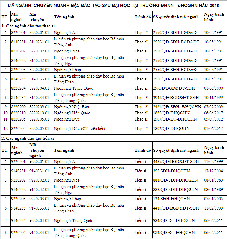 Thực hiện QĐ số 250/ QĐ-ĐHQGHN ngày 18/1/2018 của Giám đốc Đại học Quốc gia Hà Nội về việc chuyển đổi các ngành, chuyên ngành đào tạo ở ĐHQGHN theo danh mục giáo dục đào tạo cấp IV trình độ đại học, thạc sĩ, tiến sĩ; Trường ĐHNN – ĐHQGHN thông báo tới học viên và nghiên cứu sinh về việc chuyển đổi các ngành, chuyên ngành đào tạo ở ĐHQGHN cụ thể như sau: