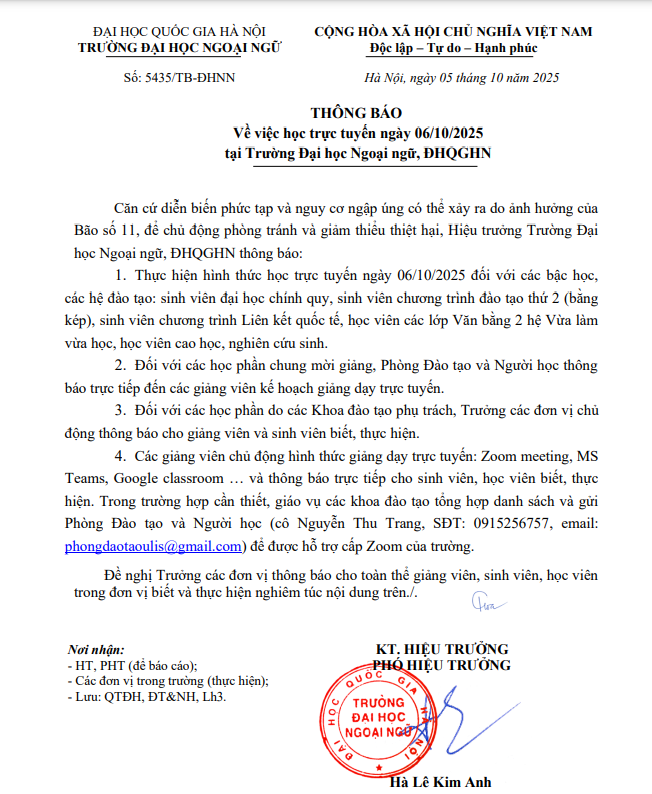 Bão số 11, để chủ động phòng tránh và giảm thiểu thiệt hại, Hiệu trưởng Trường Đại học Ngoại ngữ, ĐHQGHN thông báo: Thực hiện hình thức học trực tuyến ngày 06/10/2025 đối với các bậc học,các hệ đào tạo: sinh viên đại học chính quy, sinh viên chương trình đào tạo thứ 2 (bằng kép), sinh viên chương trình Liên kết quốc tế, học viên các lớp Văn bằng 2 hệ Vừa làm vừa học, học viên cao học, nghiên cứu sinh.