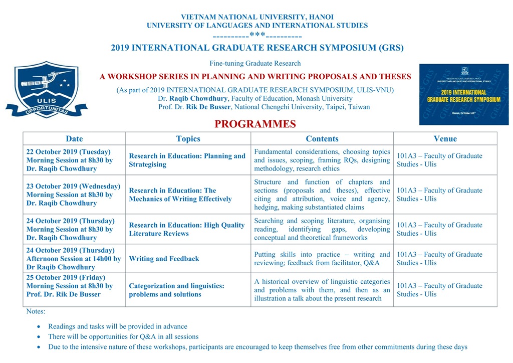 Khoa Sau đại học xin thông báo tới các anh chị nghiên cứu sinh và học viên cao học về việc tham dự các “Buổi chuyên đề học thuật” trong các ngày từ 22 đến 25/10/2019 và tham dự “Hội thảo khoa học quốc tế dành cho học viên và nghiên cứu sinh GRS 2019” vào ngày 26/10/2019, cụ thể: