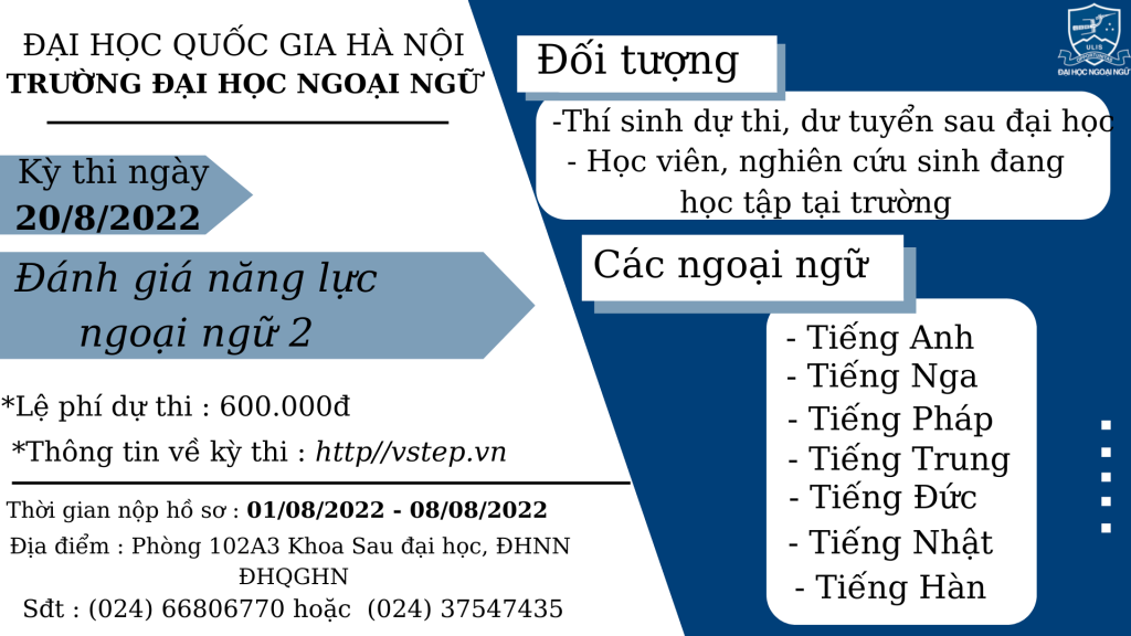 Thông báo về việc tổ chức kỳ thi đánh giá năng lực ngoại ngữ thứ 2 đối với thí sinh dự thi/dự tuyển đào tạo sau đại học năm 2022
