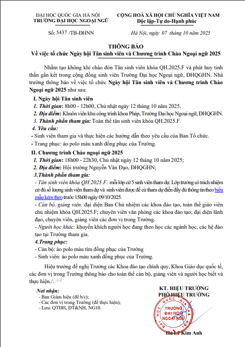 Nhằm tạo không khí chào đón Tân sinh viên khóa QH.2025.F và phát huy tinh thần gắn kết trong cộng đồng sinh viên Trường Đại học Ngoại ngữ, ĐHQGHN, Nhà trường thông báo về việc tổ chức Ngày hội Tân sinh viên và Chương trình Chào Ngoại ngữ 2025