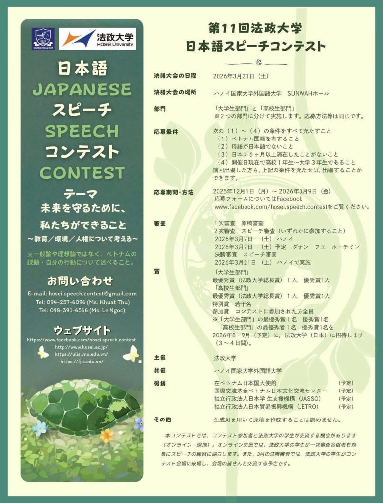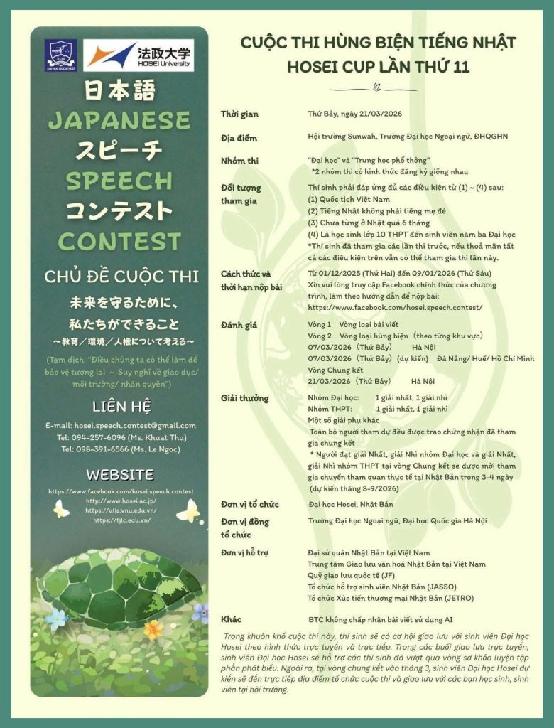 ✨Hãy trở thành một phần của Cuộc thi hùng biện tiếng Nhật Hosei Cup lần thứ 11 ngay thôi nào! Hãy cùng Hosei 2025 lan toả những hành động thiết thực, những bước chân đầu tiên trong hành trình bảo vệ tương lai để những suy nghĩ không chỉ dừng lại ở “tưởng tượng” mà thực sự được chung tay gây dựng!