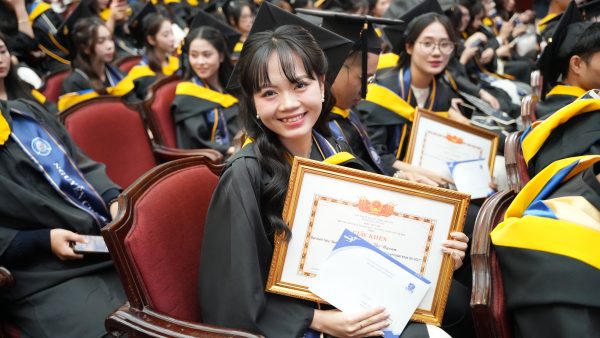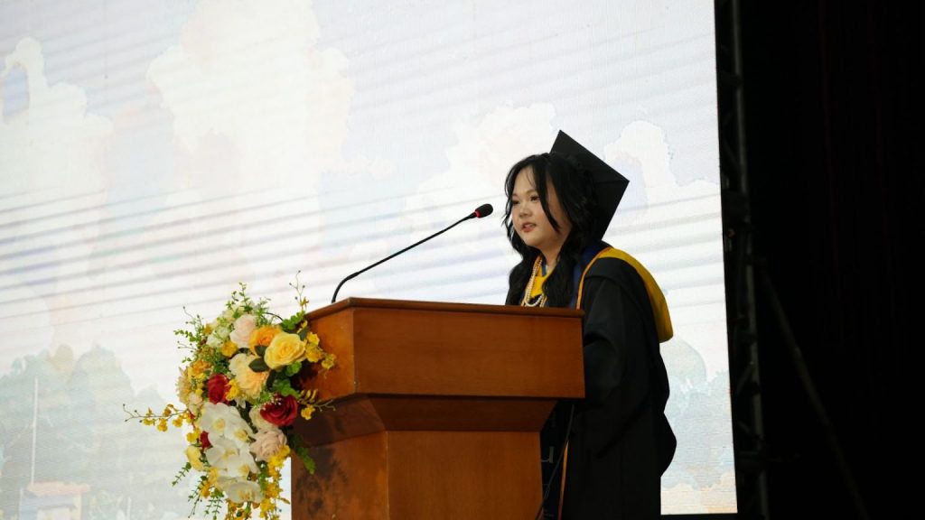 Đại diện cho 146 tân cử nhân,, tân cử nhân Phương Bích Vân chia sẻ cảm xúc của mình về hành trình của mình tại ULIS: “Khi nhin lại chặng đường đã qua, điều đọng lại trong mình không chỉ là điểm số hay thành tích, mà là những khoảnh khắc nhỏ bé nhưng đầy ý nghĩa.”. Bạn cũng gửi lời cảm ơn và sự biết ơn sâu sắc tới công lao sinh thành, nuôi dưỡng của cha mẹ và sự giúp đỡ, chỉ dạy của toàn các thầy, cô Trường Đại học Ngoại ngữ.