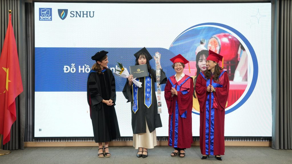 Đại diện Trường Đại học Southern New Hampshire, GS.TS. Rita Naughton xúc động gửi lời chúc mừng tới các tân thạc sĩ. GS.TS. Rita nhắc lại những kỷ niệm trong quá trình đồng hành cùng học viên, đồng thời hy vọng mỗi người sẽ coi đây là “khoảnh khắc đáng nhớ trong cuộc đời”. GS.TS. Rita Naughton tin tưởng rằng với nền tảng kiến thức và kỹ năng đã tích lũy, các tân thạc sĩ sẽ trở thành những nhà giáo thành công, hạnh phúc và có nhiều đóng góp cho cộng đồng.