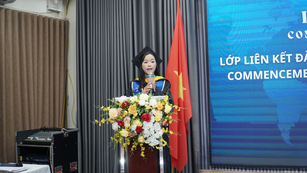 Đại diện khóa 44, tân thạc sĩ Lê Thùy Linh xúc động chia sẻ niềm vinh dự khi được thay mặt toàn thể học viên phát biểu tại buổi lễ. Cô gửi lời cảm ơn chân thành đến Khoa Giáo dục Quốc tế, Trường Đại học Ngoại ngữ, Trường Đại học Southern New Hampshire và các giảng viên, những người đã truyền cảm hứng, tạo động lực để học viên có thể vượt qua khó khăn, cân bằng giữa học tập, công việc và gia đình. Theo tân thạc sĩ Lê Thùy Linh, thành quả hôm nay không chỉ là minh chứng cho sự kiên trì, nỗ lực của từng cá nhân mà còn phản ánh tinh thần đoàn kết, sự sẻ chia và khát vọng học hỏi không ngừng của tập thể toàn khóa. Học viên nhấn mạnh rằng: “Hành trình thạc sĩ tuy đã khép lại, nhưng những trải nghiệm quý giá, sự gắn bó và những bài học về tri thức, kỹ năng sẽ là hành trang vô giá cho chặng đường phía trước”.