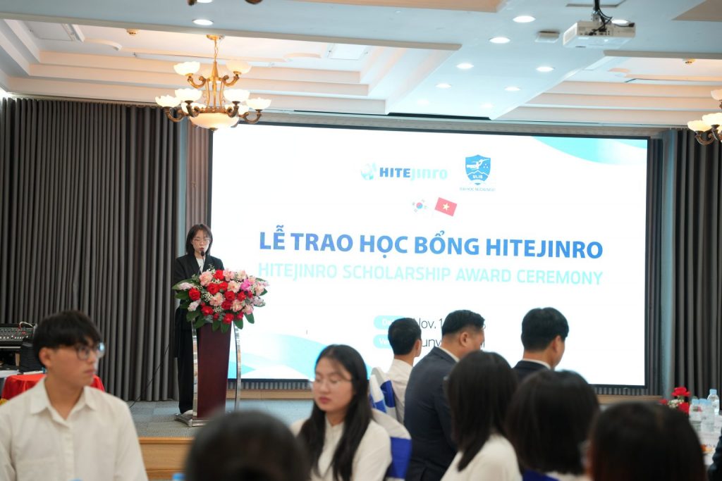 Phát biểu tại buổi lễ, ông Kim In Kyu – Chủ tịch Tập đoàn HITEJINRO đã gửi lời chúc mừng tới những sinh viên được trao học bổng. Chủ tịch Tập đoàn HITEJINRO hy vọng những suất học bổng này sẽ tạo điều kiện học tập tốt, góp phần xây dựng tương lai và ước mơ cho các em sinh viên, những người sau này sẽ trở thành nền tảng to lớn cho sự phát triển của Việt Nam và góp phần phát triển mối quan hệ Việt – Hàn.