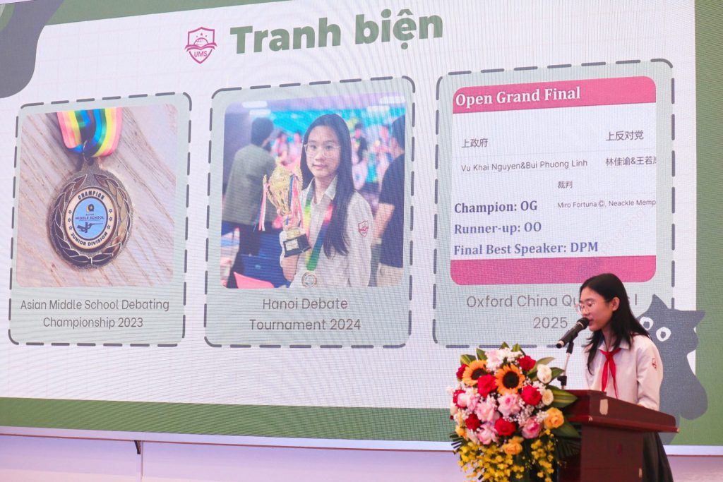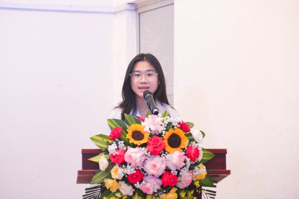 Đến từ Trường THCS Ngoại ngữ, em Bùi Phương Linh đã báo cáo thành tích học tập cá nhân đồng thời bày tỏ lòng biết ơn với Nhà trường, các thầy cô đã tận tuỵ dìu dắt. Em nhấn mạnh kỉ luật là yếu tố để em đạt được thành công như bây giờ và sẽ không ngừng nỗ lực trong thời gian tới.