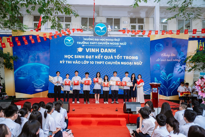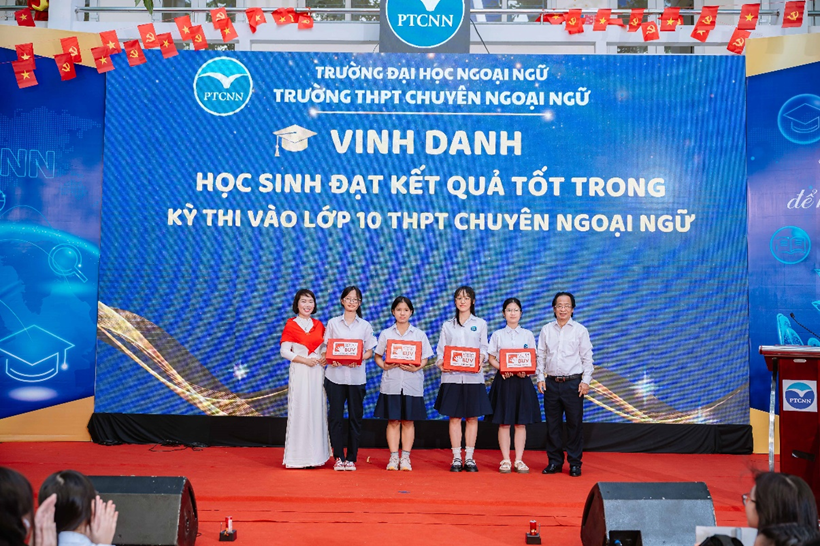 Tiếp theo buổi lễ là phần vinh danh những học sinh đạt thành tích xuất sắc trong kỳ thi tuyển sinh đầu vào của Trường THPT Chuyên Ngoại ngữ. Phần khen thưởng được TS. Đỗ Thị Ngọc Chi – Phó Hiệu trưởng Nhà trường trang trọng công bố, ghi nhận nỗ lực và trí tuệ của những gương mặt tiêu biểu. Đây không chỉ là giây phút tôn vinh thành quả của các em, mà còn là minh chứng cho truyền thống đào tạo mũi nhọn, nuôi dưỡng tài năng mà Nhà trường luôn tự hào gìn giữ và phát huy.