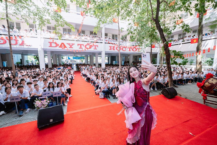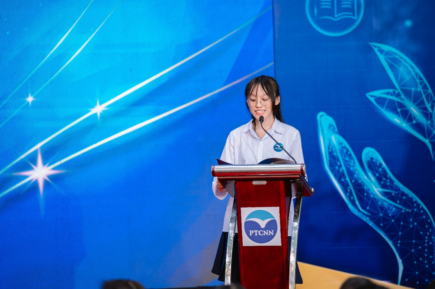 Để đáp lại những lời dặn dò tha thiết và sự khích lệ đầy tin tưởng từ phía Nhà trường, em Nguyễn Bảo Châu – học sinh lớp 10A9, từng là thủ khoa Chuyên Anh Trường THPT Chuyên Lê Quý Đôn, tỉnh Khánh Hòa – đã đại diện cho K57 phát biểu trước toàn trường. Bảo Châu bày tỏ niềm vinh dự khi trở thành thành viên của đại gia đình Chuyên Ngoại ngữ, đồng thời khẳng định quyết tâm học tập, rèn luyện trong môi trường giàu bản sắc và truyền thống. Hình ảnh một nữ sinh vượt ngàn cây số để chọn CNN như mái nhà mới đã để lại ấn tượng sâu sắc, khơi gợi niềm tự hào và tiếp thêm cảm hứng cho thầy trò trong ngày khai giảng.