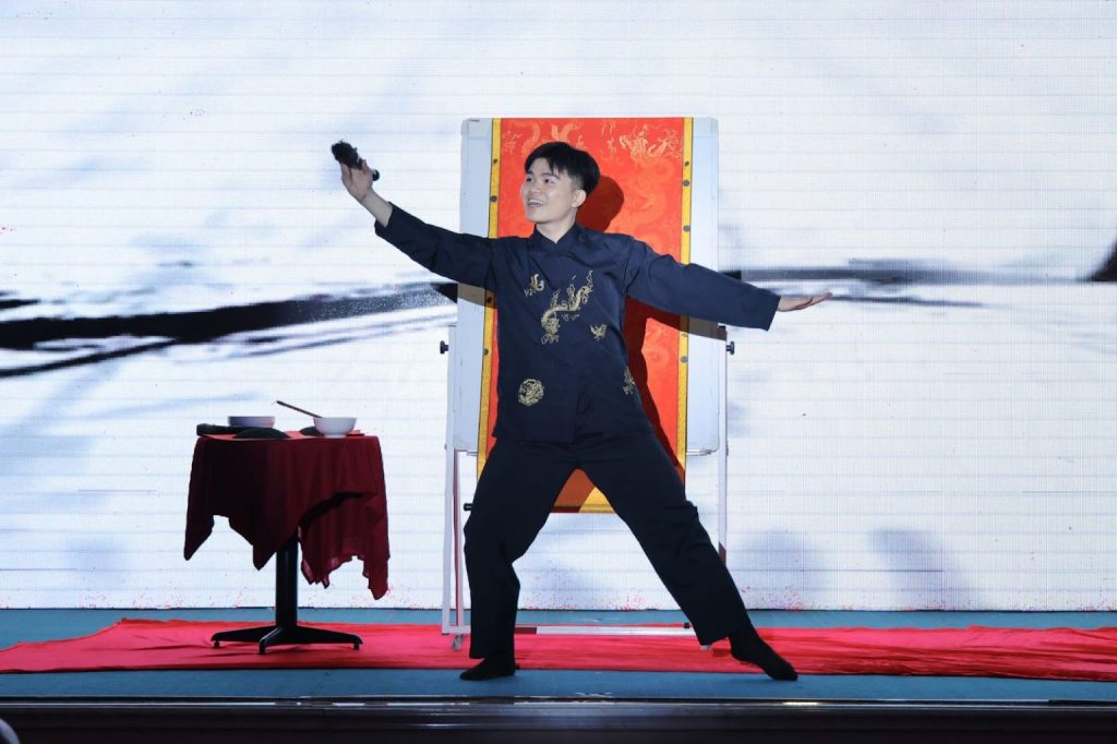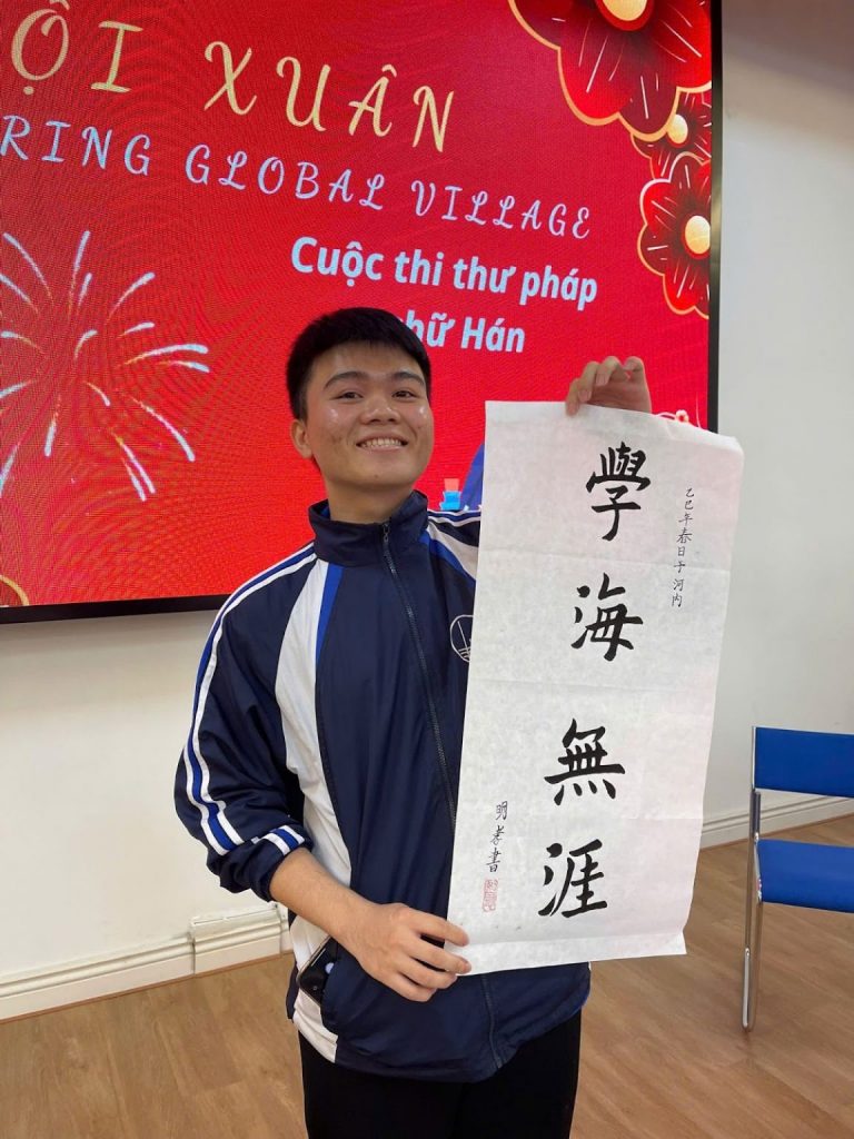 Ngay khi nghe cô chia sẻ ý tưởng, mình rất hứng thú và bắt tay vào chuẩn bị. Tuy nhiên, viết thư pháp bằng keo không hề dễ vì keo đặc, khó điều khiển nét chữ như mực, nên mình phải luyện tập nhiều lần, liên tục điều chỉnh độ đặc, lỏng để tạo được nét viết như ý. Nhưng chỉ có viết thôi thì vẫn chưa đủ đặc sắc. Vì vậy, các cô trong đoàn hướng dẫn đã gợi ý kết hợp thêm phần biểu diễn Thái cực quyền để tiết mục thêm chiều sâu và đậm nét văn hóa Trung Hoa. Mình thật sự lo lắng vì chưa từng tập Thái cực quyền, nhưng cô Nhân đã kết nối giúp: liên lạc với chị Ái Lâm người từng đạt giải Nhì cuộc thi năm 2023 với tiết mục Thái cực quyền ấn tượng để được tư vấn, đồng thời tìm một thầy biên đạo múa chuyên nghiệp hỗ trợ xây dựng phần trình diễn hoàn chỉnh nhất cho sân khấu.