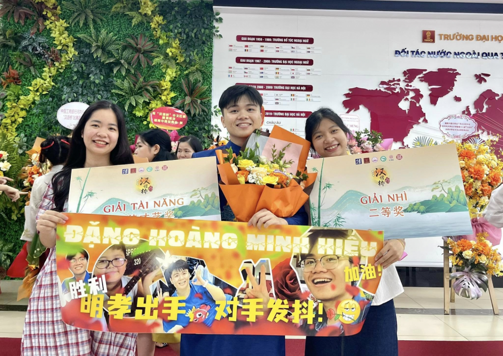 Đặng Hoàng Minh Hiếu, hiện là sinh viên năm 2 Khoa Ngôn ngữ và Văn hóa Trung Quốc, Trường Đại học Ngoại ngữ, Đại học Quốc gia Hà Nội. Đến từ mảnh đất học Nghệ An, bắt đầu theo học tiếng Trung chỉ mới hơn một năm nhưng Minh Hiếu đã gặt hái nhiều thành tích nổi bật. Với tinh thần cầu tiến và đam mê ngôn ngữ, gần đây nhất, Minh Hiếu đã xuất sắc giành Giải Nhất phần thi Tài năng và Giải Nhì “Nhịp cầu Hán ngữ” do Viện Khổng Tử tại Trường Đại học Hà Nội, Trung tâm Hợp tác Giao lưu Ngôn ngữ giữa Trung Quốc và Nước ngoài (CLEC) và Đại sứ quán Trung Quốc tại Việt Nam phối hợp tổ chức.