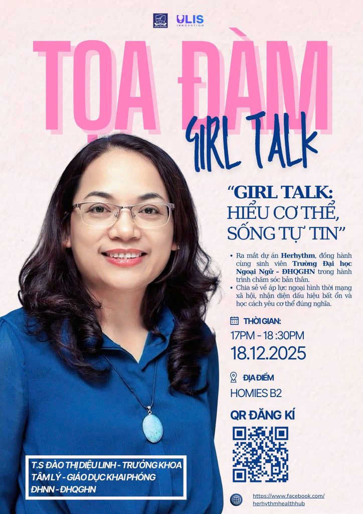 Nhằm nâng cao nhận thức cho nữ sinh về sức khỏe sinh sản và sức khỏe tinh thần, đồng thời cung cấp kiến thức khoa học chính thống về những thay đổi sinh lý, tâm lý ở tuổi trưởng thành, dự án Herhythm chính thức ra mắt, đồng hành cùng sinh viên Trường Đại học Ngoại ngữ, ĐHQGHN trong hành trình chăm sóc bản thân. Trong khuôn khổ dự án, buổi tọa đàm “Girl Talk: Hiểu cơ thể, sống tự tin” được tổ chức dành riêng cho nữ sinh ULIS, tạo nên một không gian an toàn và cởi mở để lắng nghe, trò chuyện và trang bị những kiến thức quan trọng giúp các bạn chăm sóc cơ thể, bảo vệ bản thân và xây dựng lối sống lành mạnh.